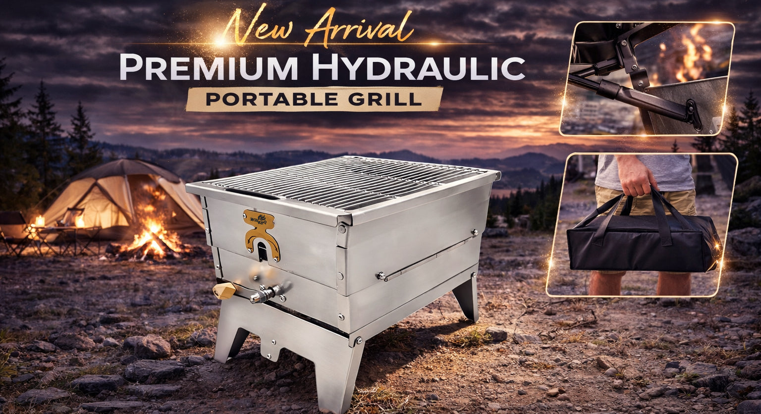The WillBBQ Exclusive Hydraulic Height Adjustable Portable Charcoal Grill is built for campers and outdoor cooks who want a solid, dependable grilling experience in a compact footprint. Featuring a raised-leg structure with a hydraulic support system, the grill remains stable on uneven ground, helping prevent tipping during use. Its adjustable charcoal plate allows precise height control, making it easy to fine-tune heat intensity for different cooking needs. With a generous grilling surface, it delivers steady airflow, consistent heat, and a comfortable cooking height. Constructed entirely from Premium Stainless Steel, this grill is durable, easy to clean, and well-suited for camping trips, beach BBQs, picnics, and backyard use.