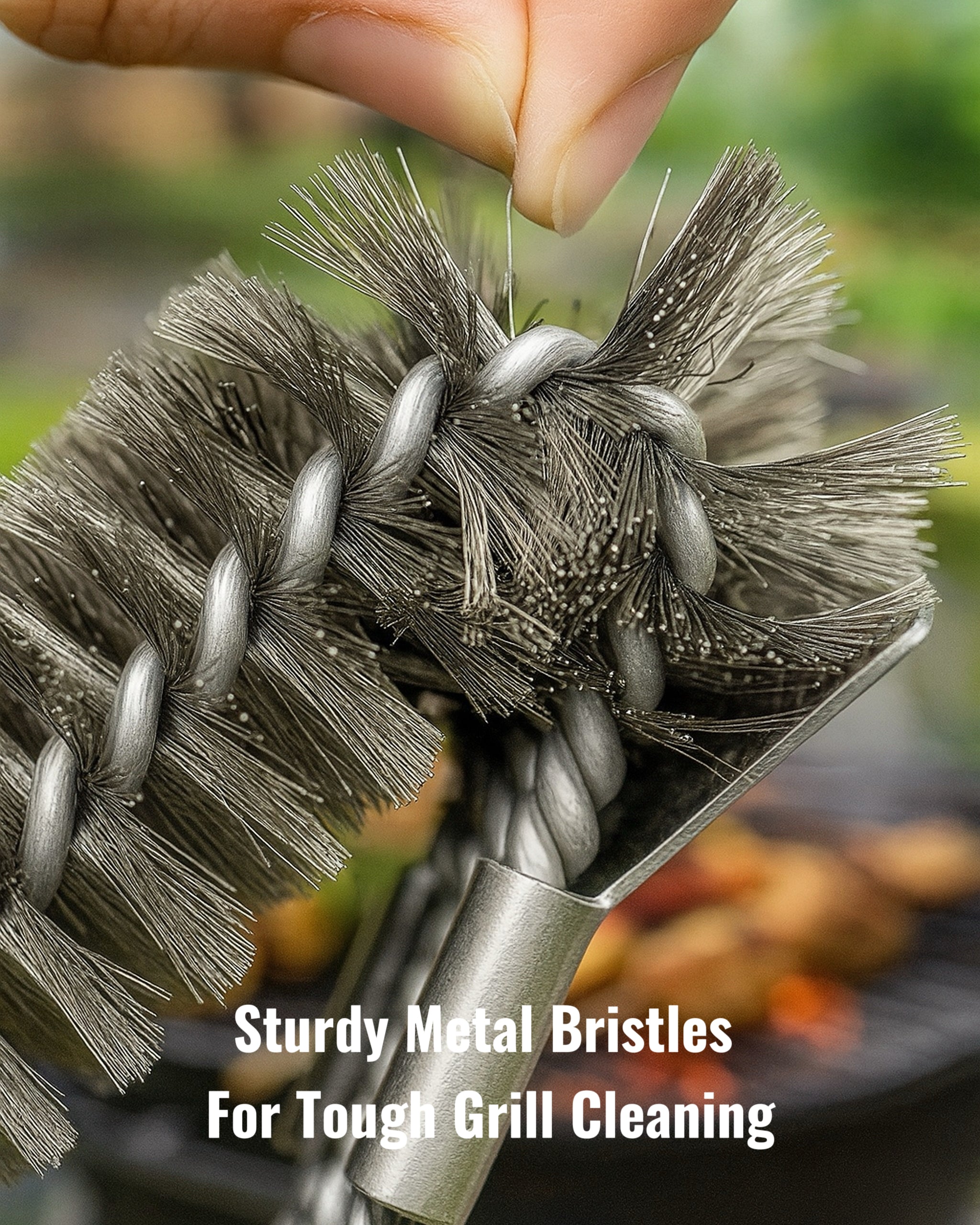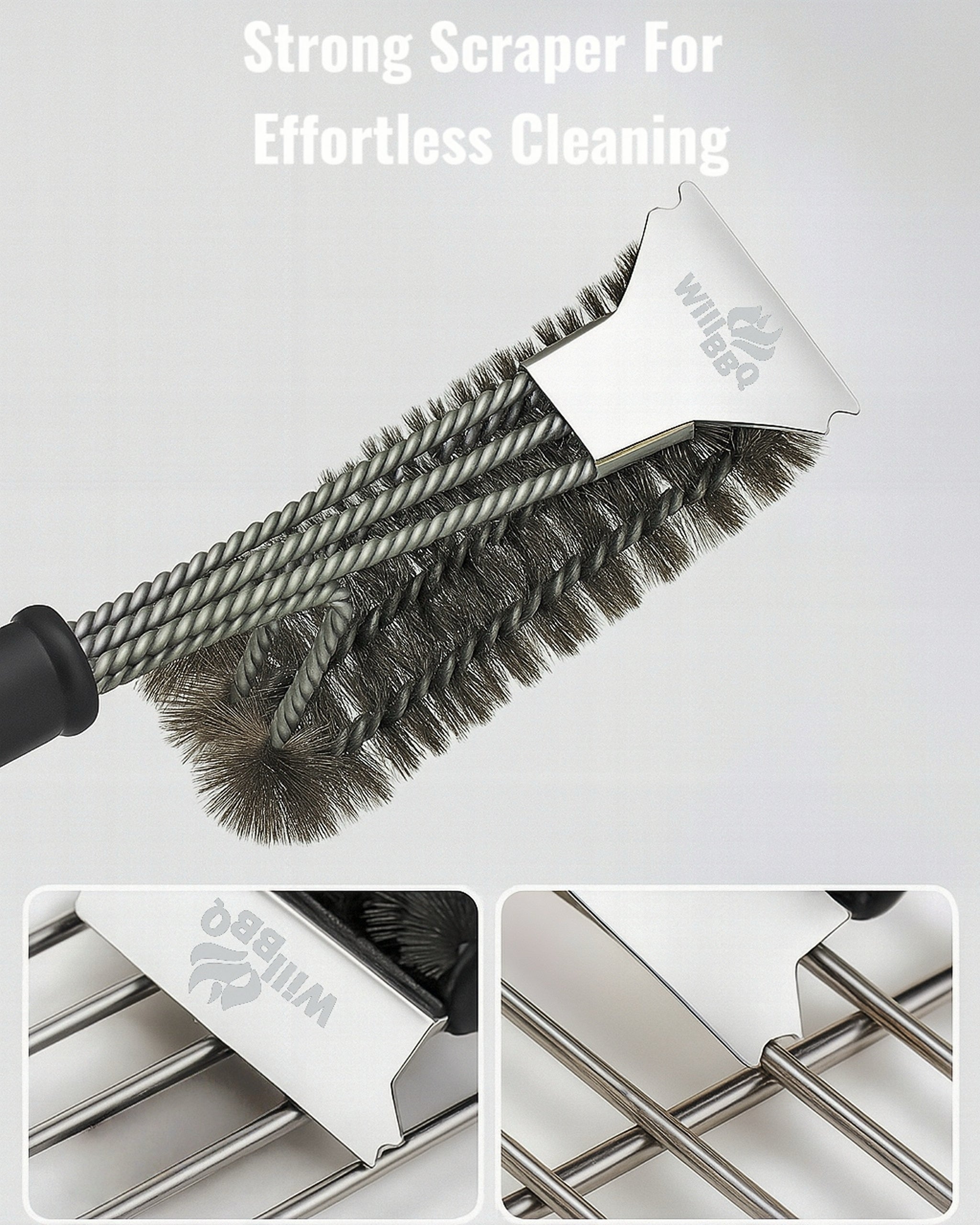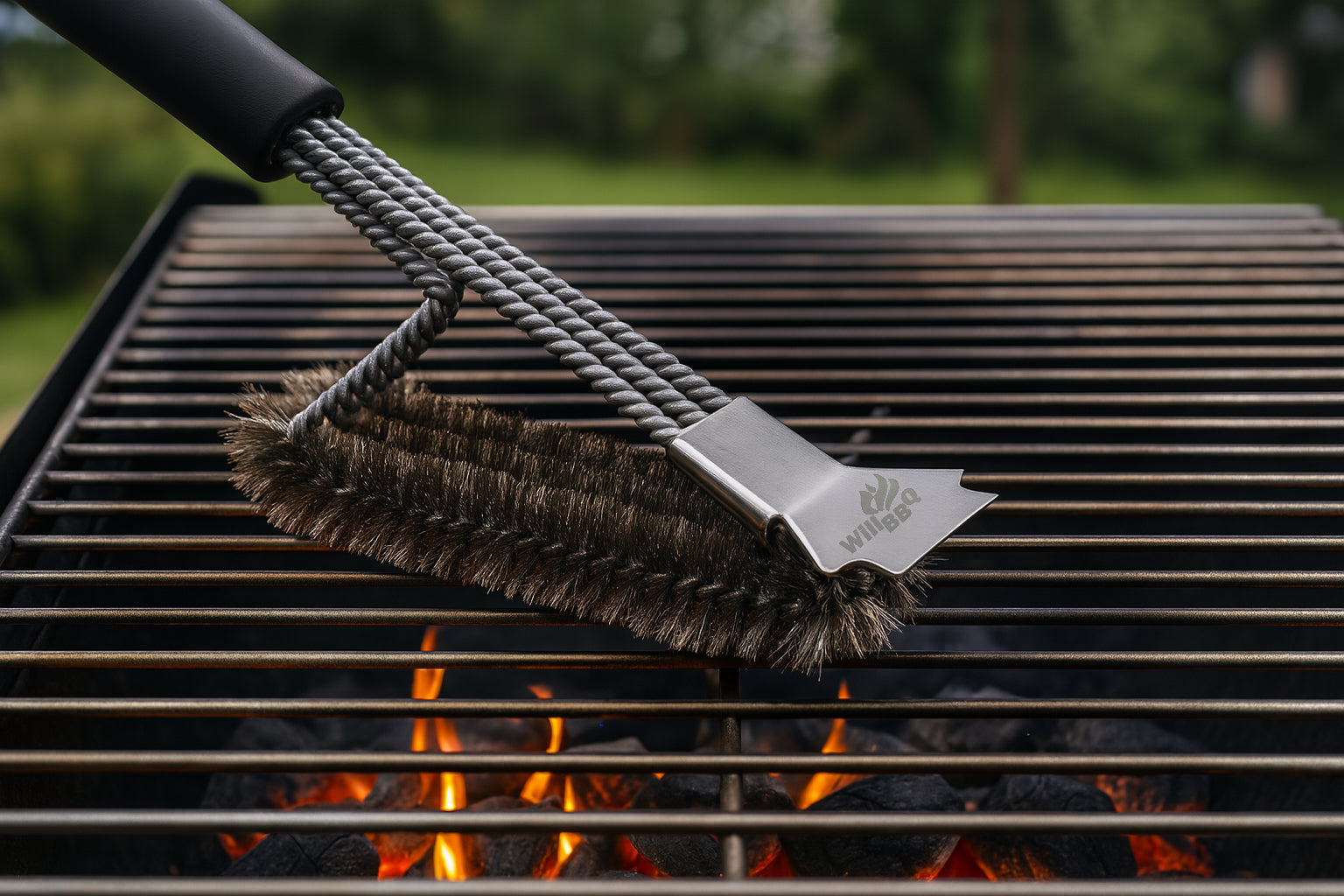 The WillBBQ Triple Coil Grill Cleaning Brush offers powerful scrubbing action for all types of BBQ grates. Its coiled wire design covers more surface area than traditional bristle brushes while eliminating loose bristles. With a wide cleaning head, long handle, and durable construction, this brush delivers fast and effective cleaning before or after every grilling session.