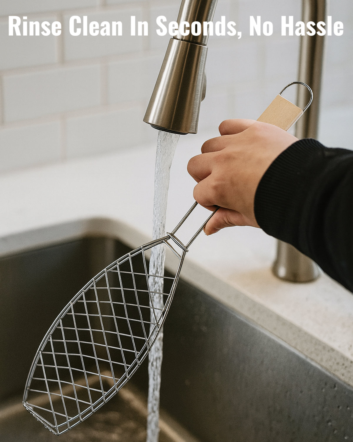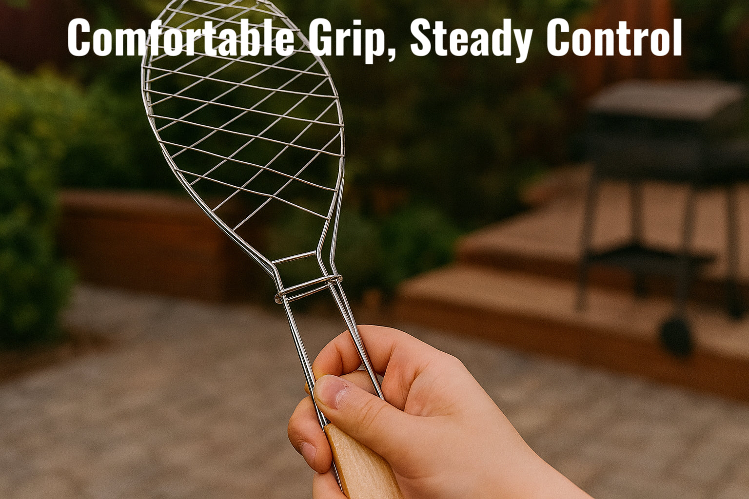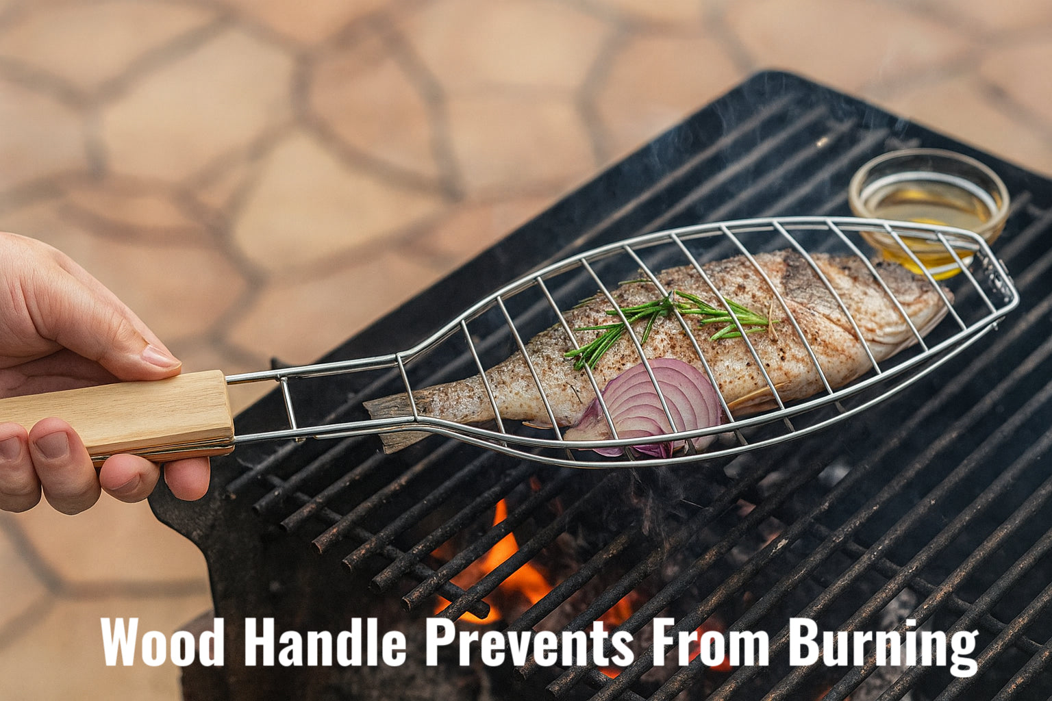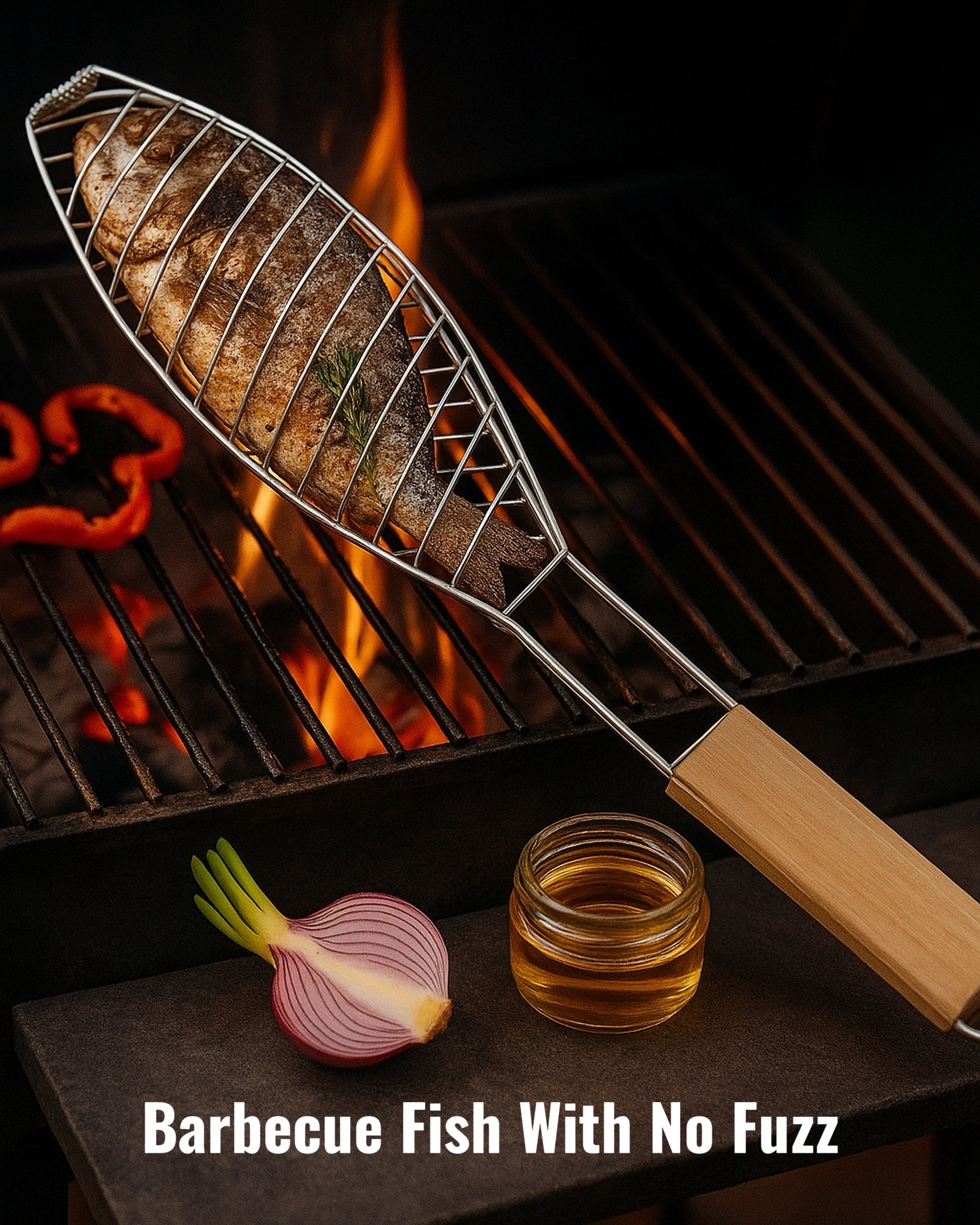 Perfect for whole fish and other delicate seafood, this uniquely shaped grilling basket holds food securely in place during cooking. The curved wire structure conforms to fish or fillet shape, while the locking mesh keeps everything intact during flipping. The extra-long wooden handle stays cool and gives you extended reach for safety and control. Built with Premium Stainless Steel, this basket offers excellent heat resistance and easy cleaning after use.