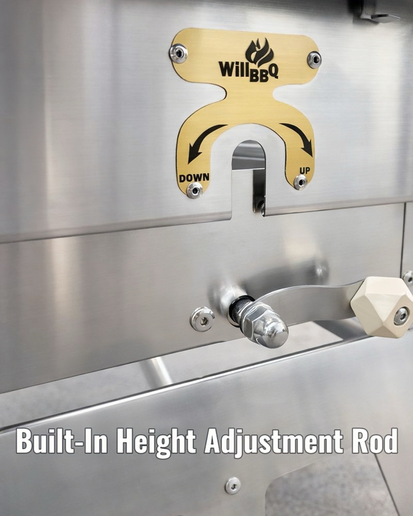The WillBBQ Exclusive Hydraulic Height Adjustable Portable Charcoal Grill is built for campers and outdoor cooks who want a solid, dependable grilling experience in a compact footprint. Featuring a raised-leg structure with a hydraulic support system, the grill remains stable on uneven ground, helping prevent tipping during use. Its adjustable charcoal plate allows precise height control, making it easy to fine-tune heat intensity for different cooking needs. With a generous grilling surface, it delivers steady airflow, consistent heat, and a comfortable cooking height. Constructed entirely from Premium Stainless Steel, this grill is durable, easy to clean, and well-suited for camping trips, beach BBQs, picnics, and backyard use.